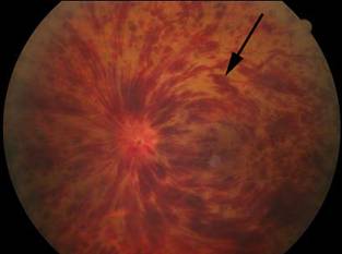 Resim 1: Yandaki resimde santral retinal ven tıkanıklığı (retinanın büyük veni) olan bir hastanın retinası görülmektedir. Kanamaların ( siyah ok ) tüm retinayı kaplamış olduğu izlenmektedir.