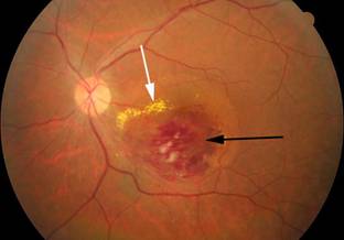 Resim 2: Ven dal tıkanıklığı (büyük venin dalları) olan hastanın retina görüntüsü. Kanamaların sadece tıkalı olan ven bölgesinde olduğu izlenmektedir (siyah ok). Kanamalara ek olarak sarı renkteki yağ birikimleri beyaz okla gösterilmektedir.