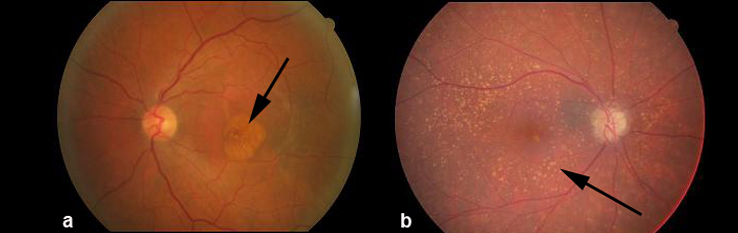 Resim 1 (a,b): Üstteki resimlerde, kuru tip yaşa bağlı makula dejeneresansına bağlı sarı renkteki madde birikimleri (drusen) gösterilmektedir (siyah oklar).