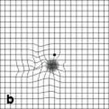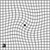 Resim 5: Sarı nokta hastalığı gibi makulasında hasar olan birisi normal bir Amsler kartının ortasındaki siyah noktaya baktığı zaman çevredeki çizgilerde eğrilme (a) veya üzerlerinde siyah gölge (b) varmış gibi görür.