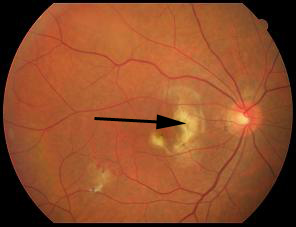 Resim 3: Yandaki resimde, yaş tip sarı nokta hastalığına bağlı, sarı-beyaz renkte membran skarı görülmektedir (siyah ok).